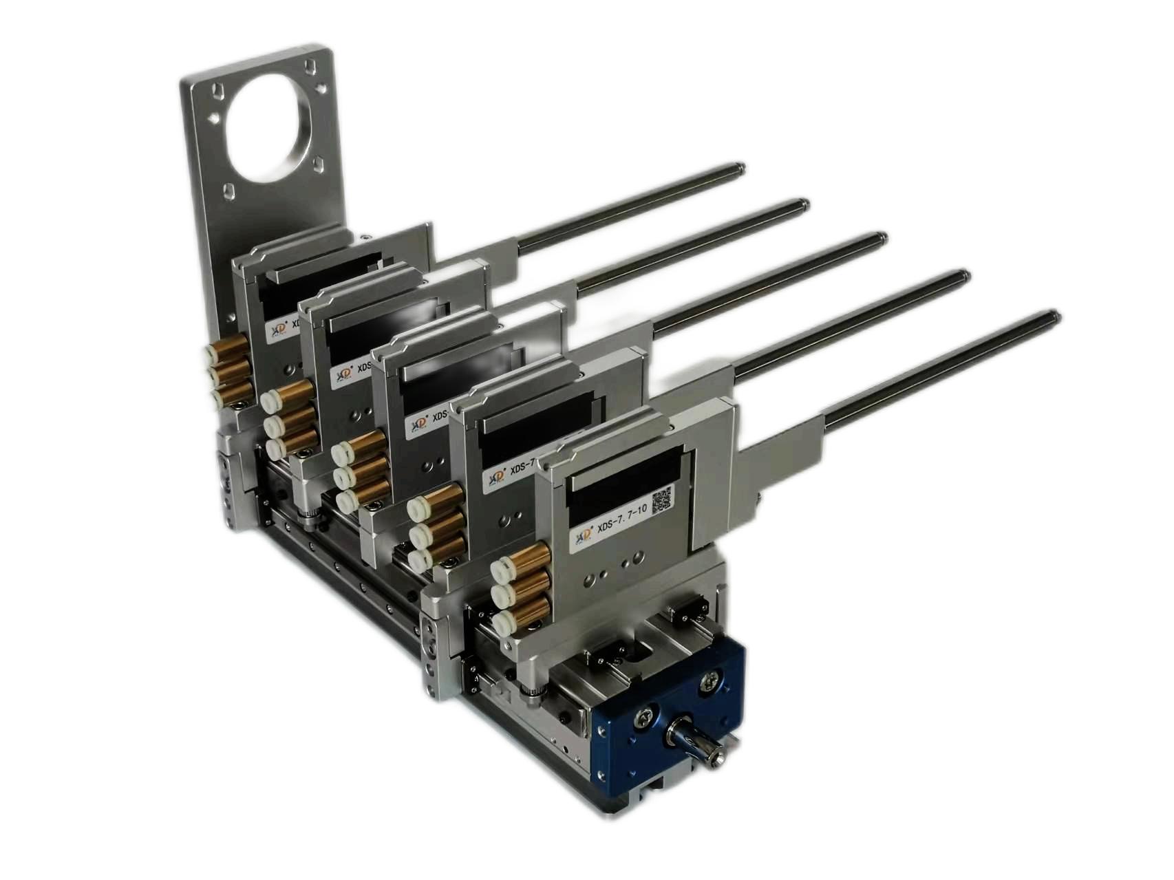 為了提高工件的輸送效率,變距滑臺通常安裝在自動化設(shè)備或機器人上。在輸送工件的過程中,送料裝置中的工件通常由變距滑臺取出,然后裝入另一個接料裝置中。為了提高裝配效率,通常會同時抓取多個工件,然后裝入接料裝置。然而,進料裝置中的工件與接料裝置中的工件之間的距離不同,并且進料裝置中的工件可以通過變間距滑臺穩(wěn)定地輸送到接料裝置。